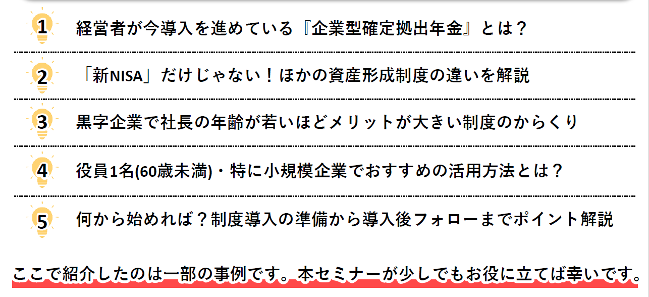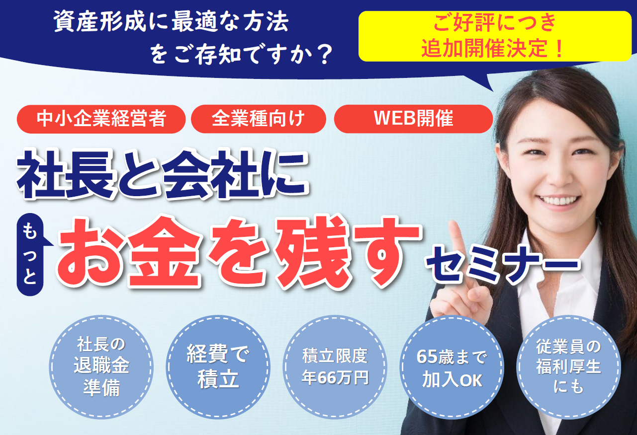 また、税制優遇と福利厚生の強化を両立できる制度でもあります。本セミナーでは、制度の仕組み・導入メリットから、就業規則の整備、金融機関・運営管理機関の選定、従業員教育まで、実務の全体像を具体例を交えてわかりやすく解説いたします。